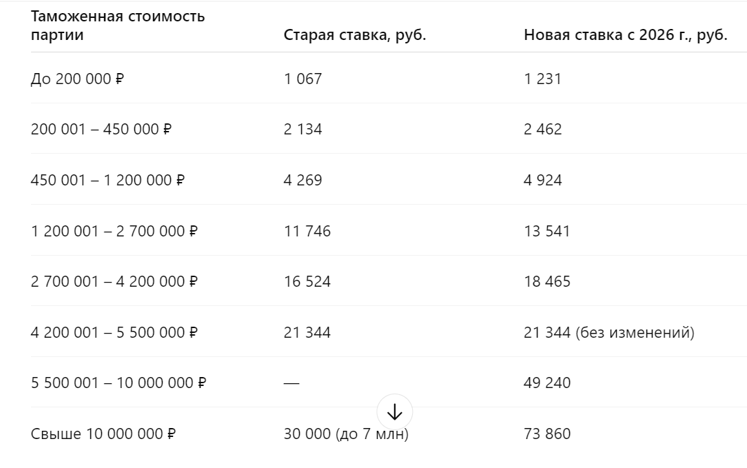 Отдельные категории товаров, такие как радио- и электронные изделия, ранее имевшие фиксированную ставку 30 000 ₽, также перейдут на обновлённую максимальную ставку 73 860 ₽ независимо от размера партии.